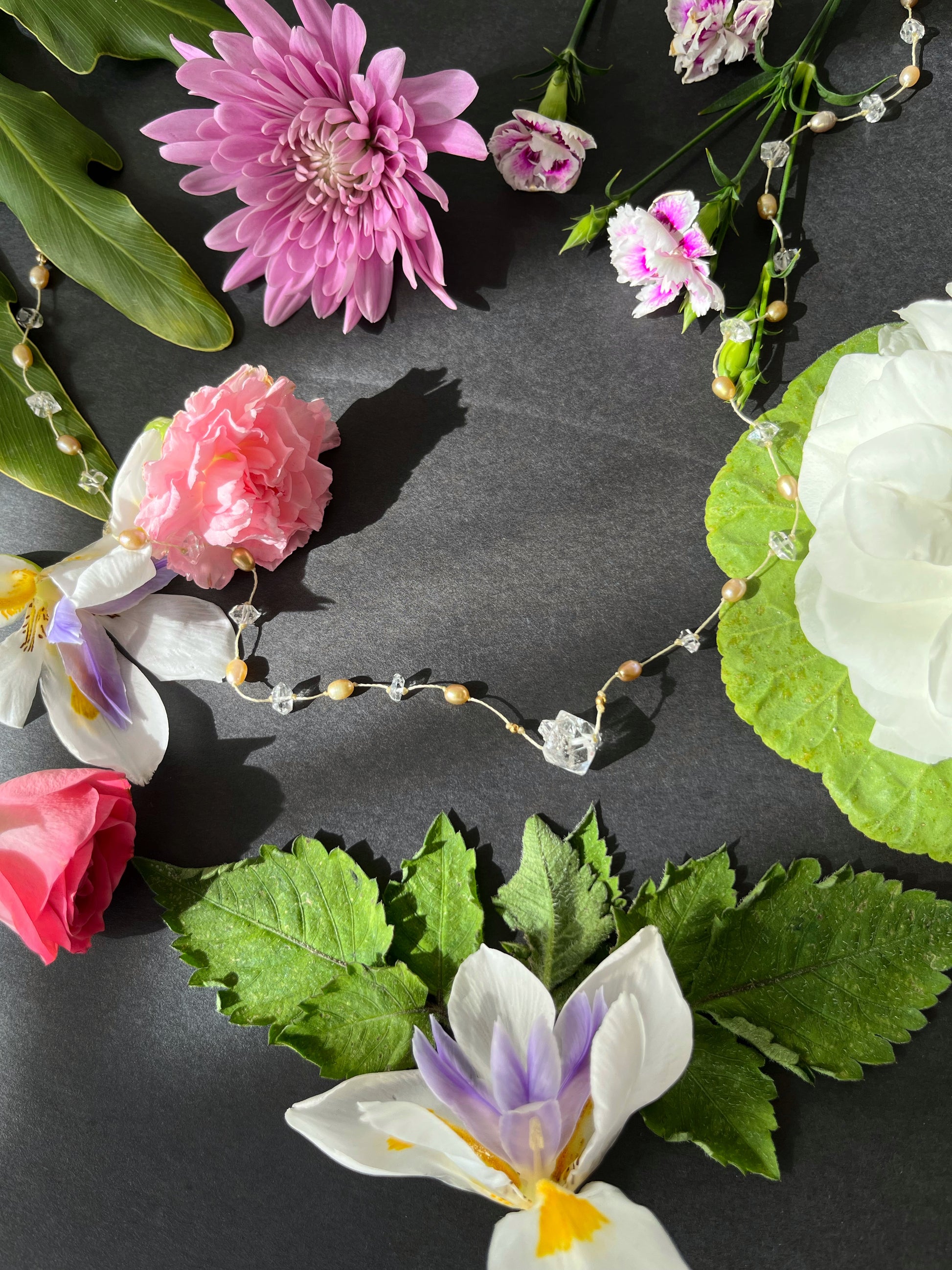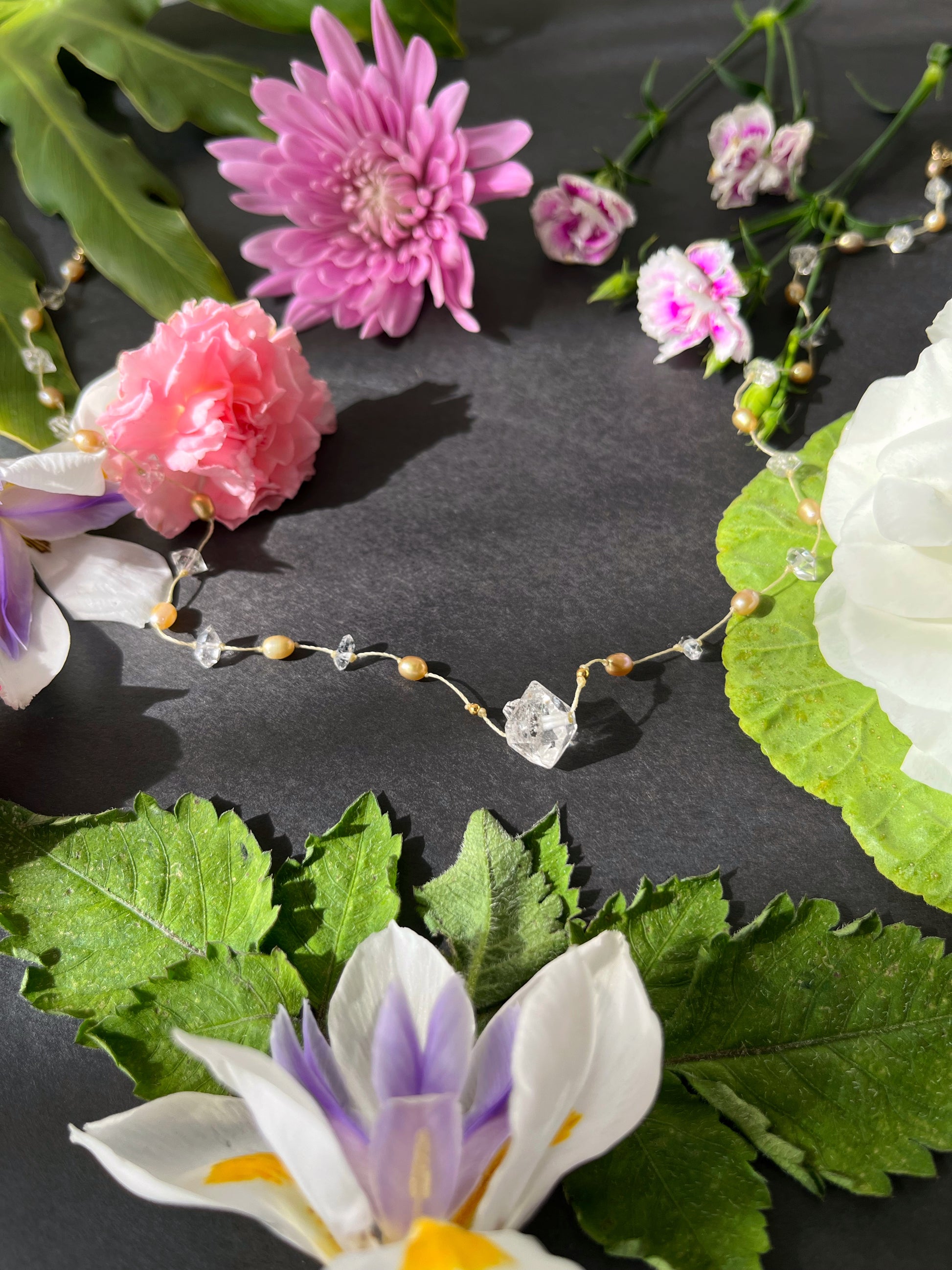 Herkimer Diamonds, pearl, and 18 karat solid gold.
